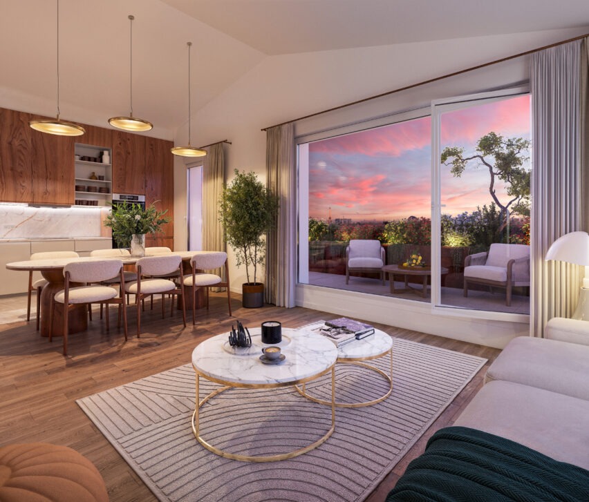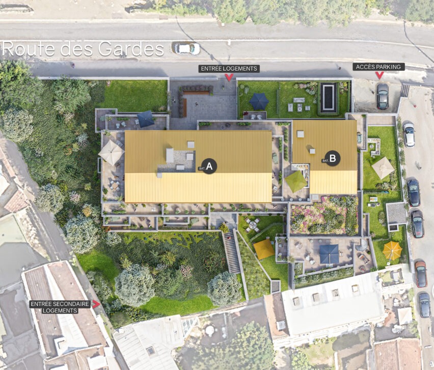 Les toitures alternent terrasses végétalisées et terrasses accessibles, participant à la qualité paysagère de l’ensemble.